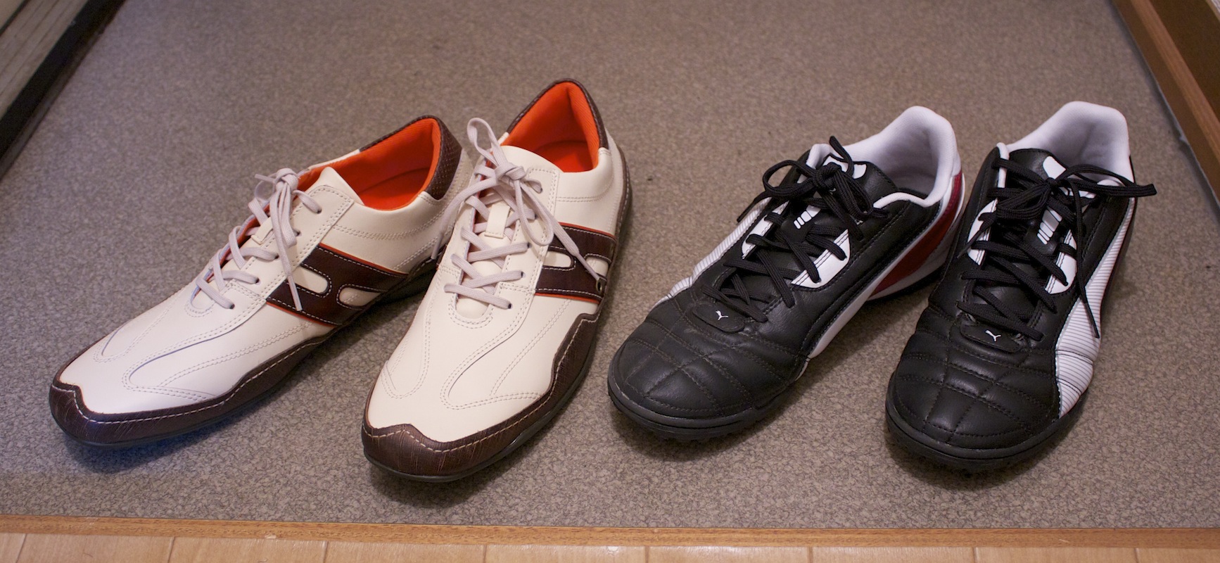 おNEW おNEWは、若い世代には死語になりつつあるようですね毎日履いていた靴の底が破れてしまい、今週末の豪雨による浸水を期に今回新しく2足分を購入致しました(^_^)前回履いていたのホーキンスの靴がデザインと履き心がとても良く、初めて全く同じ物(左側)をリピートです(^▽^)/あまりにも代わり映えが無いので、写真の右側のプーマのフットサルシューズを購入した次第です。早速、意気揚々とこのフットサルシューズを履いて会社でリフティングをしたところ、まったく上手になっていませんでしたよ( ̄▽ ̄;)!!ガーン [0回]