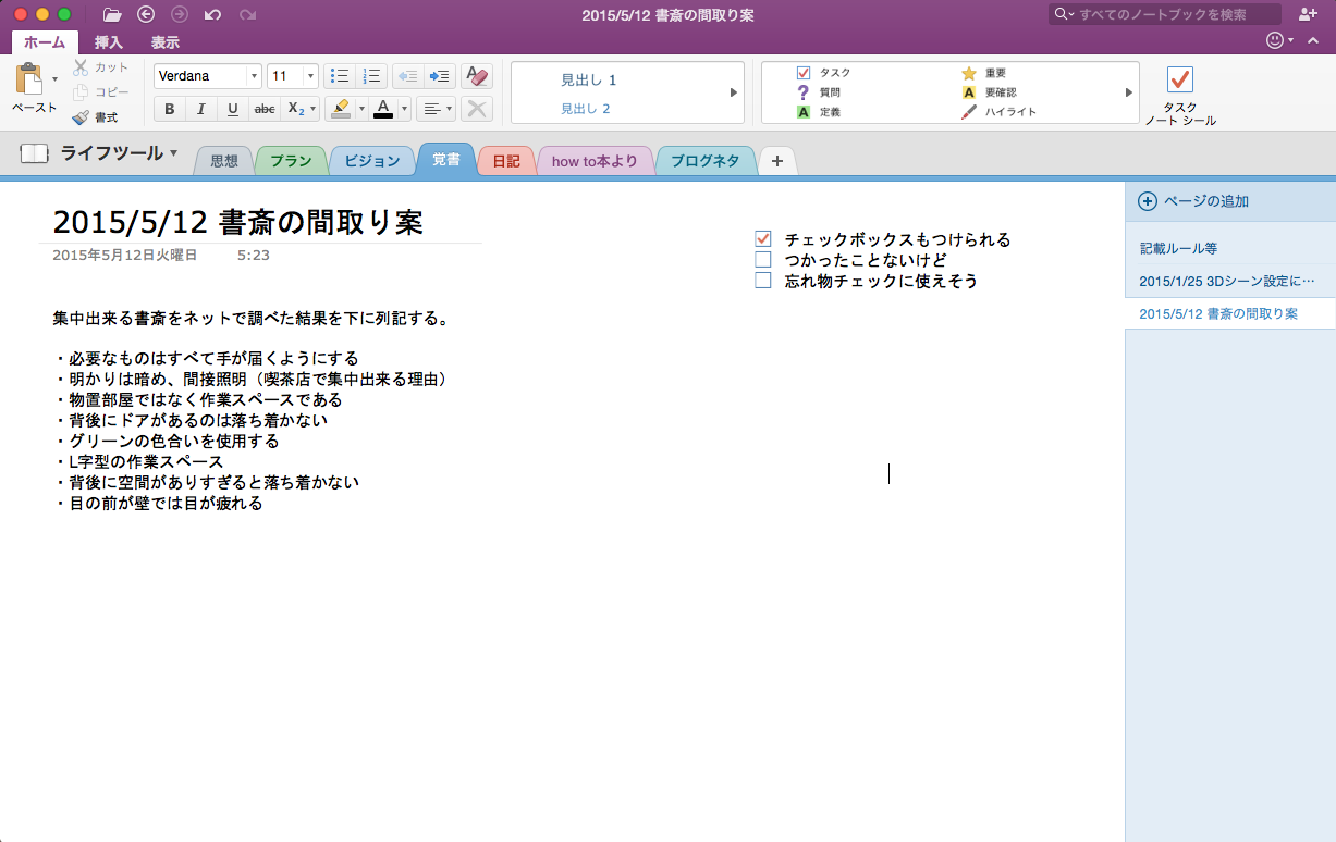 Microsoft OneNoteは無料版で仕事が出来る! 会社の、ある先輩がたまに使う言葉で「従業員にパソコンを支給したからといって、みんな同じだけの仕事が出来るわけではないよね」という名言?があり、人の持つ能力を加味して判断すべきであるということに対する例え話ですが、それを聞いた時、僕は自分がパソコンを本当に使えているのだろうかと不安になったりします。例えば、Excelをちゃんと使える人は、ソフトウエアの持つ機能を最大限に研究しギリギリまで数式を組み合わせて使用します。数式だけではどうしようもなくなった時に初めてマクロ(プログラム)を組むという手法で実にスマートなシートを形成しています。(社内でいうとシステム課は勿論、生産管理課の一部の方々には脱帽です)一方、へなちょ根性ガエルな僕は、一つのソフトウエアを使いこなせないなら、使い勝手のいいのを探しちゃおう!と夜にビールを片手に検索、、、人によっては盲点なのですが、普段から使っている、WordやExcel、PowerPointが全てでなく自分の仕事を遂行する上で使いやすいソフトウエアが数々存在し、これを使用するということはパソコンの活用のもう一つの方法だと思います。例えば名刺管理ソフト、ホームページ作製用素材集などが挙げられます。前置きが長くなりましたが、表題のMicrosoft OneNote(無料版)についての半年ほど使ってみての使い心地と有用性を書きたいと思います。⬛ソフトウエアの目的とは違った使い方大学などの授業中にパソコンでノートをとることを目的に開発されたソフトウエアで、他に有名なものとしてEVERNOTEなどがあります。パソコンでノートをとる学生が教室にいたら、スカしたナルシスト風に写りますよね^^;このソフトを知った当初は、授業を受けるわけでもなく、仕事中パソコンを持ってウロウロするわけでもない自分には縁のないものとして捉えてました。ただ、このソフトウエアは紙媒体のノートの弱点を見事に克服しています。それは、過去に書いた内容で、どのノートの、どのページに記入したのかを忘れてしまった様なシーンに対して検索が出来ることです。通常、3ヶ月から半年ごとに、授業が区切られ期末テストが行われる為、必要なノートと内容を見失うことはありませんが、受験などのように広範囲な場合には、かなり有効なのではないでしょうか。その機能の応用というか、それも加味して作られたかはわかりませんが、僕にとっては、閃いたアイデアや、仕事のキーワードを殴り書きしておくことによって、必要な情報を思い出すことや、アイデアを組み合わせて整理する「思考ツール」として活用出来ることがわかりました。◾️半年ほど使用して知ったこと作ったものを提出して評価して貰うというものではない為、成果との関連は見えにくいですが、例えば、僕は会社に入社してから10冊ほどのノートを書いてきました。そこから過去にどんな仕事をしたかを探して思い出さなければならない時などは、かなりの時間をロスしていると思います。実際にどのくらいロスがなくなり仕事量が増えたかはわかりませんが、思考の整理と組み合わせれば、今までよりも良い精度で仕事が出来ているようながします。 ↑普通の部屋なんですが、書斎を作るという気概をもって部屋の配置を変えました!具体的に、①僕の場合、ライフツールとワークツールという二つのデータを作っています。 学生で言えば、化学とか社会などの使い分けでしょうか、 ライフツールは画像にもあるようにプライベートで考えごとをする時に使っており 対してワークツールは仕事の内容ですがセキュリティー上の危険性を加味しており、 断片的な書き方をしています。②次に、タブごとの項目ですが、学生の場合で例えば「社会」というデータの内容だとしたら、 タブはマクロ経済とか社会統計学などの授業ごとの単位になると思います。③そしてタブごとに、日付や項目を題したページを追加していくといった感じで使用します。 (画像の左) このページに写真やExcelデータも簡単に貼り付けることが出来ます。①〜③のように構成されることで、わざわざ検索にかけなくてもそこそこ整理出来るのでとても便利です。◾️セキュリティを心配しました。無料版の特徴(制約)として、必ずマイクロソフトのOneDriveというクラウド上に保存しなければならないということです(バックアップはパソコン上に記録しているようです)どのパソコンからでもアクセス出来る点は便利ですが、個人的な情報が常にネット上にあるという感覚は決して良いものではありません。そこで、セキュリティ面の安全性を担保することがこのソフトを使う条件の一つでした。OneDriveはマイクロソフトのサービスである「ホットメール(旧)」か「Outlookメール」のネット上のアカウントを持っていたら使えるものですが、このアカウント固有のパスワードが一つ目のセキュリティになります。次にタブにパスワードをつけるとが出来、こ