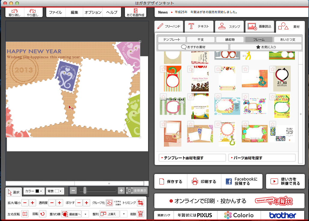 恐るべし!日本郵便 年賀状を書く時期になりましたね同僚が一年に一回、その人の事を思う時間を設ける時間ですよとありがたい格言を吐き捨てて行かれたので、手が抜けません・・・さて、当然のごとくパソコンを使って年賀状を作るのですが、今年はMacオンリーなのでどうしようと思っていました。探してみたら去年まで使用していた日本郵便のフリーソフト「はがきデザイン」はMacにも対応しているとのこと!おかげさまで今年も滞りなく年賀状が送れそうです♪ [0回]PR