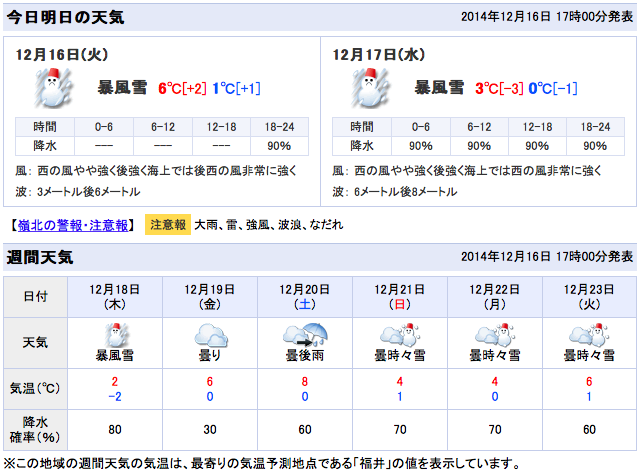 雪やこんこん・・・ 今週は3泊4日で福井県に出張です。ご存知の方も多いでしょうが、この季節の日本海側の地域は毎日天気が悪いです。天気が悪いだけならまだ良しとしましょう。ですが、天気予報を確認すると、、、 暴風雪って^^;ちなみに、後二日間福井にいます。もろやん現状は雨で、雪はこれからのようですが、どうなることやら。。。 [0回]PR