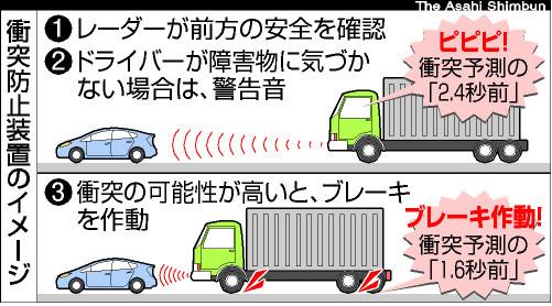自動車社会の課題 今日の昼休み、会社に出入りしているアー◯カーゴのおっちゃんと次に支給されるトラックについて話していた中でおっちゃん:「今、中国道でリフレッシュ工事してて渋滞でむっちゃ眠いねん」ミブ:「あぶないなー、じゃあ次のトラックに話題のアイサイト(衝突防止装置)みたいなんついてたら良いなぁ」などと話していて、少し気になったので調べてみたら、既にそういう話が!ーー朝日新聞(ネット版)から引用ーー被害が大きくなりがちな大型トラックによる衝突事故を避けるため、国土交通省は2014年秋以降、自動的にブレーキをかけて被害を軽減する装置の導入をメーカーに義務づける方針を決めた。ただ、装置は1台あたり30万~50万円程度の費用が必要。業界やメーカー側には戸惑いの声も出ている。 国交省によると、04年度に高速道路で発生した追突事故のうち、乗用車同士の衝突で死亡事故になったのは0.35%。一方、大型トラックが絡む事故では4.18%に跳ね上がっていた。ーーーーーーーーーーーーーーーーーートラックが絡む事故が乗用車同士の10倍以上とは!!私はドライブが好きな方ですが、宿敵である飛行機よりも死亡事故率が高いという事実についていつも気になっていた事。メーカーには幾分頑張って頂かないといけないですが、もし、これで事故が減れば・罪のない人が亡くならないですむ・被疑者となる不幸者が減る・事故が少ないので渋滞が少ない・事故がこれまた少ないので高速料金が下がると一石何鳥にもなるはず^^b ミブは大型トラックの衝突事故防止装置設置の義務化を応援します! [1回]PR