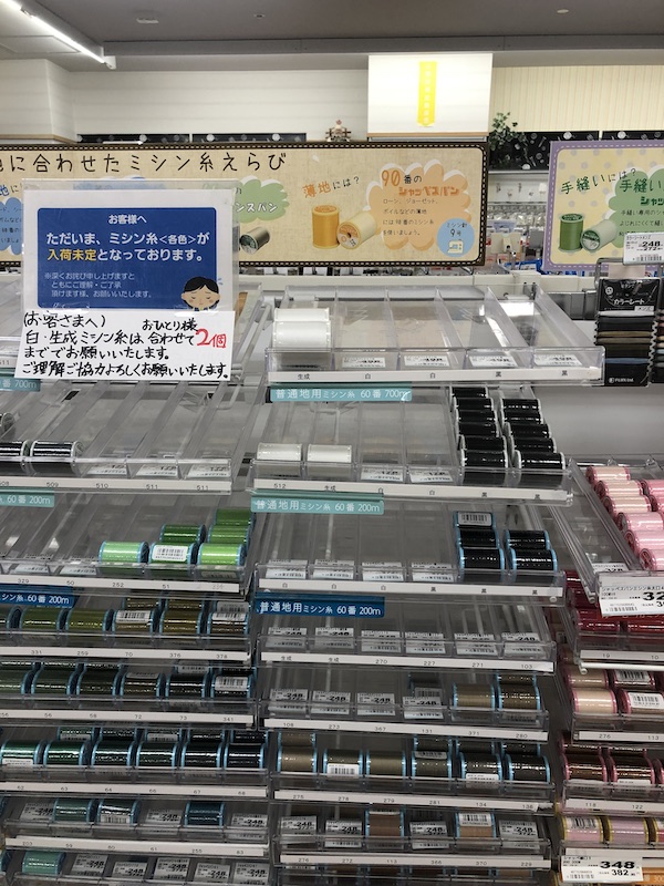 ミシン糸の棚の変化(イオン) 地元のイオンの手芸ショップ「パンドラハウス」においてある糸について手作りマスク作成に伴う需要としてコロナウイルスの影響がありましたので 5月17日ゴールデンウィーク明けで少しずつ不織布マスクが出回ってきたころですが家庭用の縫い糸は薄い色を中心に歯抜け状態に 6月11日およそ3週間後、全くなかった白が潤沢にそろっています。不織布マスクの安定供給によって糸の特需は去りそうですが、それでも一度味わったマスクがなくなる不安や冷感生地への対応などで一定の需要がまだあるようです。 [0回]PR