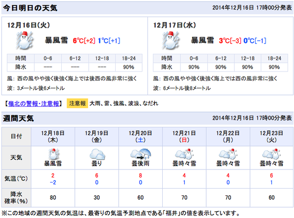 雪やこんこん・・・ 今週は3泊4日で福井県に出張です。ご存知の方も多いでしょうが、この季節の日本海側の地域は毎日天気が悪いです。天気が悪いだけならまだ良しとしましょう。ですが、天気予報を確認すると、、、 暴風雪って^^;ちなみに、後二日間福井にいます。もろやん現状は雨で、雪はこれからのようですが、どうなることやら。。。 [0回]PR