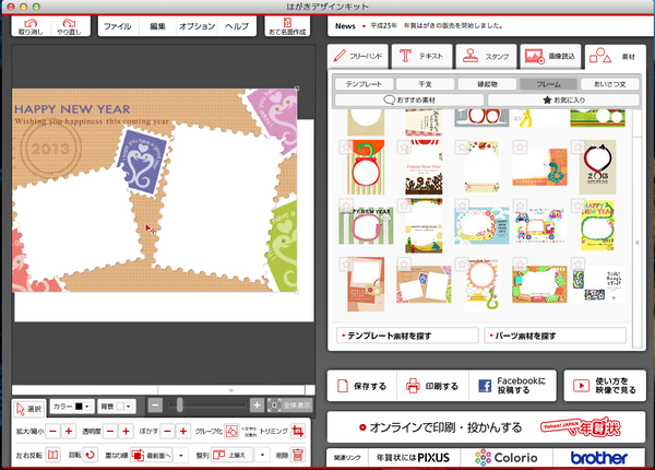 恐るべし!日本郵便 年賀状を書く時期になりましたね同僚が一年に一回、その人の事を思う時間を設ける時間ですよとありがたい格言を吐き捨てて行かれたので、手が抜けません・・・さて、当然のごとくパソコンを使って年賀状を作るのですが、今年はMacオンリーなのでどうしようと思っていました。探してみたら去年まで使用していた日本郵便のフリーソフト「はがきデザイン」はMacにも対応しているとのこと!おかげさまで今年も滞りなく年賀状が送れそうです♪ [0回]