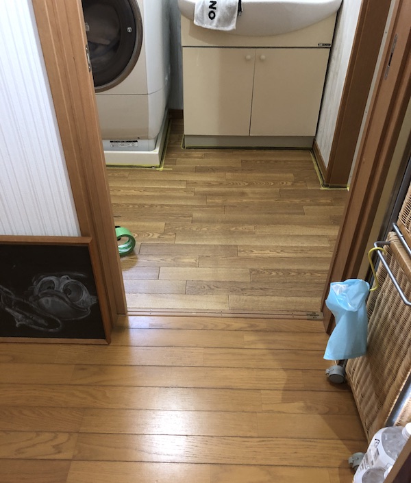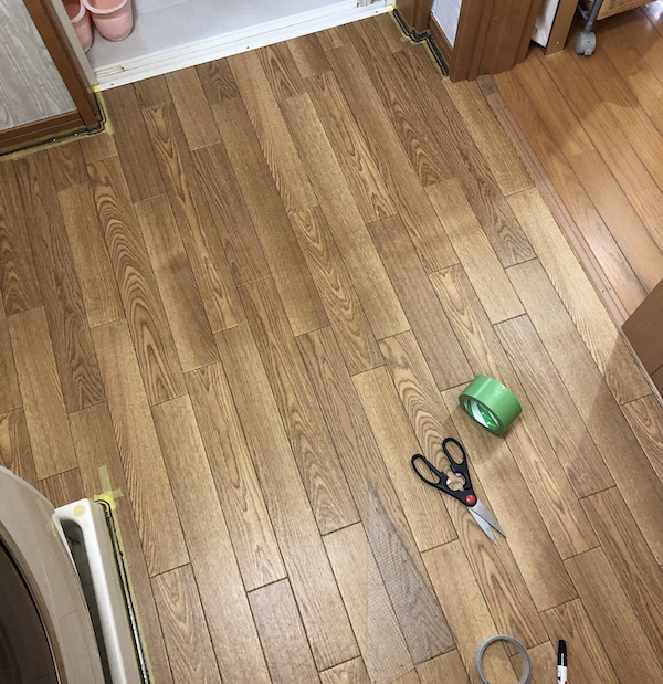 DIY 2 脱衣所の床 実家でDIYパート2です!新築時に脱衣所の床を板張りにしたばっかりに17年の歳月が流れると水気の多いところの木材が痛んできてますということで、これ以上ダメージを受けないように全く同じデザインを持ってくることはできませんが、賃貸などに使われている防水床シートを貼ることにしました。 今回、やり方はかなり悩みましたが、画用紙を重ね床の型取りをして、ネットで購入した床シートをカットしました。 ぽん!ほぼ寸法合いました。余った部分を潜り込ませる予定が想定よりも入り込まず少し微調整の為切りましたが、想定内♪この日は、床シートの端をシリコンパッキン施工して終わりです。 手前の床との統一感はなくなりましたがこれで安心して過ごせるはずです。 後日、母から送られてきた写真↑シリコンパッキンも上手く出来たようで一安心 [0回]