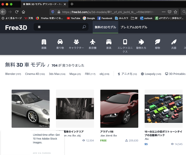 CG(コンピューターグラフィクス)の未来を占ってみる① 高校生ぐらいの時に携わりたかった仕事は3DCGを描いたり、音楽やゲームなどパソコンを使ったエンターテイメントに関わることだったりしますパソコンも早くから与えられていたのですが当時は知識がない、入り口がわからない、根性もないなどで、全然取り組むことがなかったへなちょこですが京都コンピューター学院に行きたいとも思ったりもしてました。前置きが長くなりましたが、私の子供(2歳)が好きなYouTubeの番組を見ていてふと思ったのが 技術面だけだったら、手持ちの無料のソフトを組み合わせたら自分にも出来るだろうなとはてな?この作者(海外)はゴリゴリのYouTuberで寝る間を惜しんでまで車のモデリングをしているのかそれともデータを買って組み合わせているだろうかそもそも著作権はどうなのだろうとそんな色々な謎が浮かび少し調べてみました「無料 車 3Dデータ」でググるといくつかのサイトを紹介したまとめサイトが出てきてその中で「Free3D」というサイトが無料のデータを会員登録なく落とせるので利用してみることに その中の一つを実際にダウンロードして手持ちのソフトで開いてみる つづく [0回]
